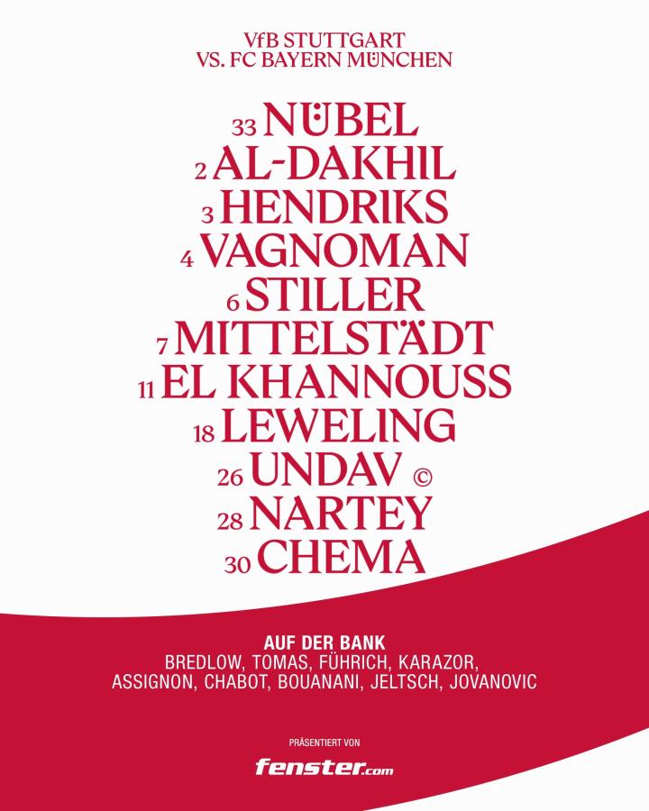 替補:1-諾伊爾(門神傷缺竟要靠三號門將救火)、26-烏爾賴希(萬年替補的命運何時能改寫?)、4-約納坦-塔(高價引援淪為替補,體育總監該負何責?)、21-伊藤洋輝(日本國腳在德甲的生存空間何在?)、44-斯坦尼希奇(青訓產品難獲重用,拜仁青訓體系是否已失效?)、45-帕夫洛維奇(塞爾維亞小將的成長速度能否跟上球隊要求?)、7-格納布里(億元先生淪為替補,薪資結構是否已失衡?)、42-倫納特-卡爾(這位無名小卒的入選,是教練組的創新還是失誤?)、9-凱恩(英格蘭隊長竟要為新援讓位,球隊地位是否已動搖?)