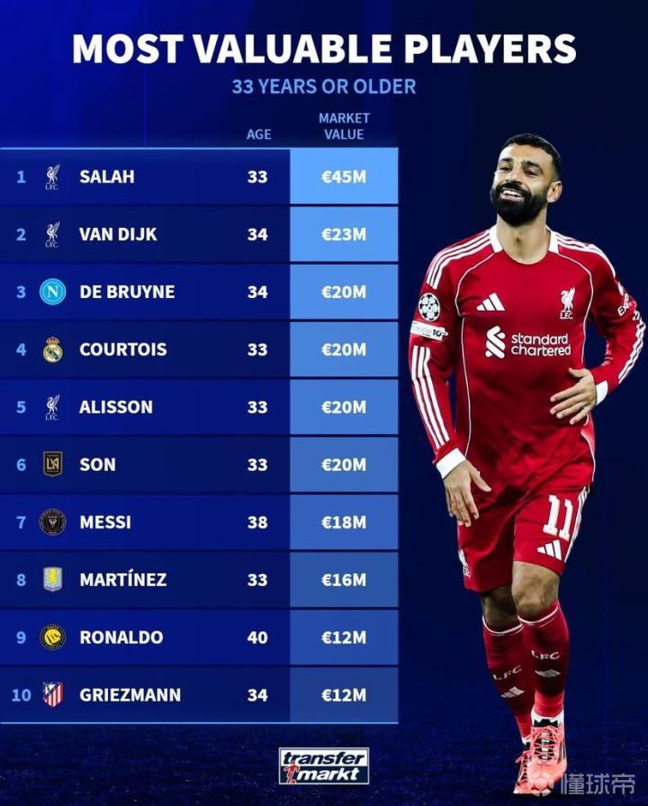 德轉(zhuǎn)33歲+球員身價(jià)前10:薩拉赫4500萬第1,梅西第7,C羅第9